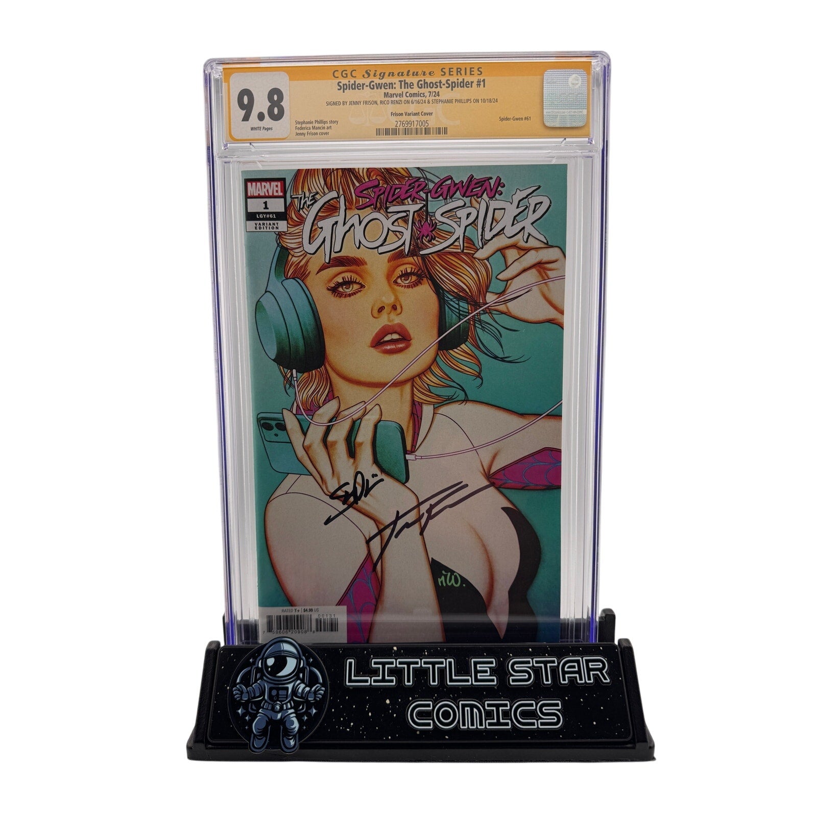 This is Spider-Gwen: The Ghost-Spider #1, featuring a stunning variant cover by Jenny Frison, slabbed CGC Signature Series 9.8 with white pages. This issue is triple-signed by the key creative team: cover artist Jenny Frison, interior colorist Rico Renzi, and writer Stephanie Phillips.